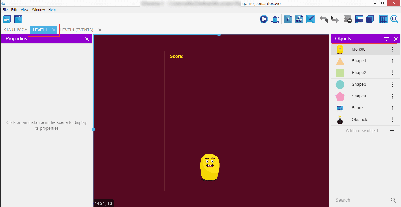 Click on the "Level1" to go back to the scene editor, then in the right panel with the "Objects" double click on the "Monster" - it will open a popup.