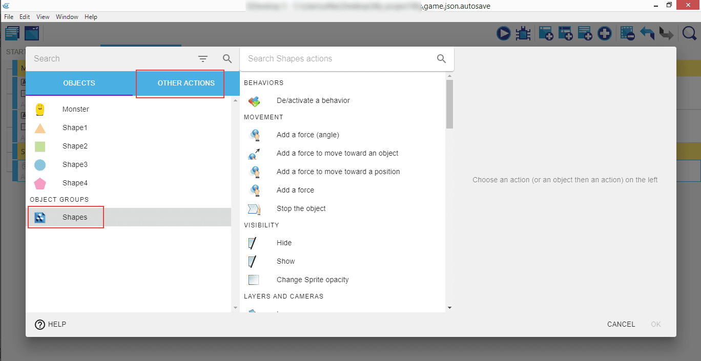 Next create a new event above the shapes event and give it the condition "at beginning of the scene", and copy/paste the earlier create "Start (or reset) a scene timer" action for "ShapeCreation" to this new event. This will start the timer at the beginning of the game in so the shapes event will trigger the first time.